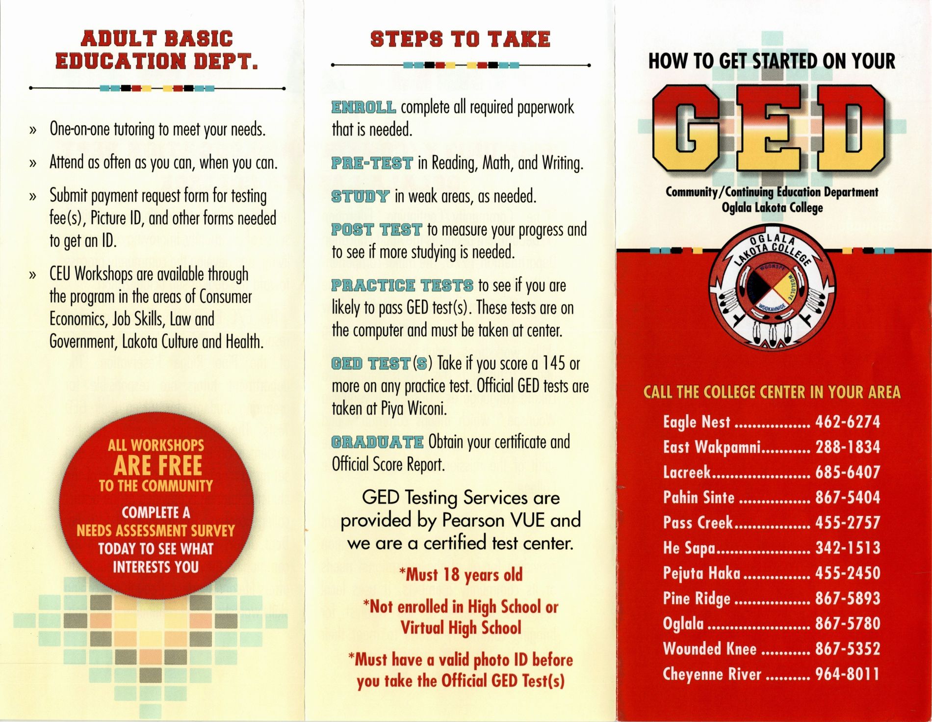The Community and Continuing Education Department offers a program responsive to the needs of the people of the Pine Ridge Reservation. The department tutors are responsible for preparing students for taking the GED tests. The instruction provided for each student is on an individualized basis set up to meet the needs of the student. Tutoring is provided at each of the local college centers. The majority of Community and Continuing Education Department tutors are bilingual and live in the community they serve. The department also offers lifelong learning through life coping skills workshops, and other continuing education opportunities.