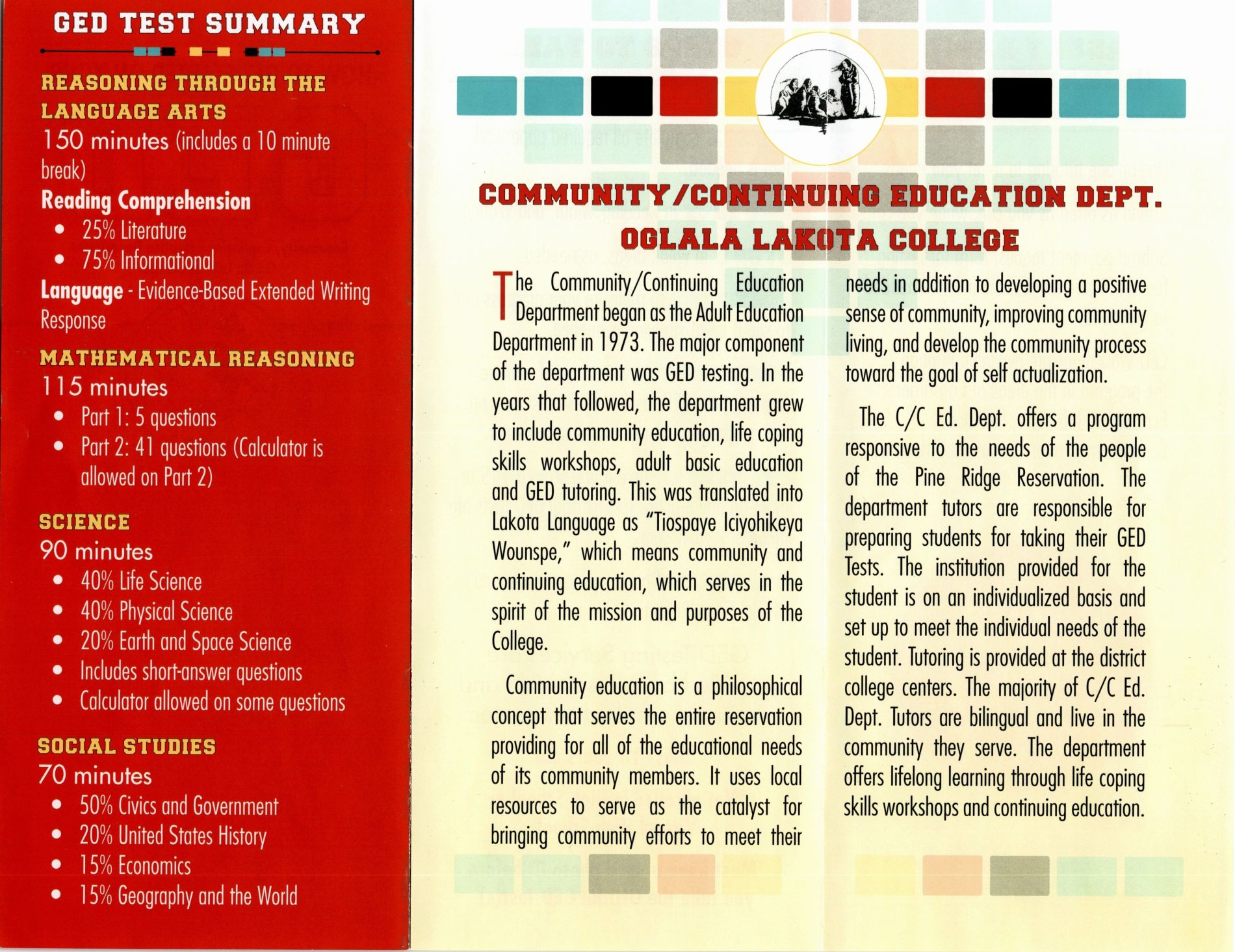 The vision of the Community and Continuing Education and GED departments is “Rebuilding the Lakota Nation through education”. Their mission is to provide community members brief learning experiences that are relevant to their personal and professional lives. Since its implementation in 1973, the Community and Continuing Education Department has been providing learning experiences for people who are wanting to complete their GED high school equivalent, or just continue learning outside of seeking a degree. In the beginning, the major focus of the department was GED testing. In the years that followed, the department grew to include Community Education, life-coping skills workshops, adult basic education and GED tutoring. The name of the department was changed from Adult Education to Community and Continuing Education. This was translated directly from the Lakota Language as "Tiospaye Iciyohikeya Wounspe," which means community and continuing education, which serves in the spirit, mission and purpose of the college.